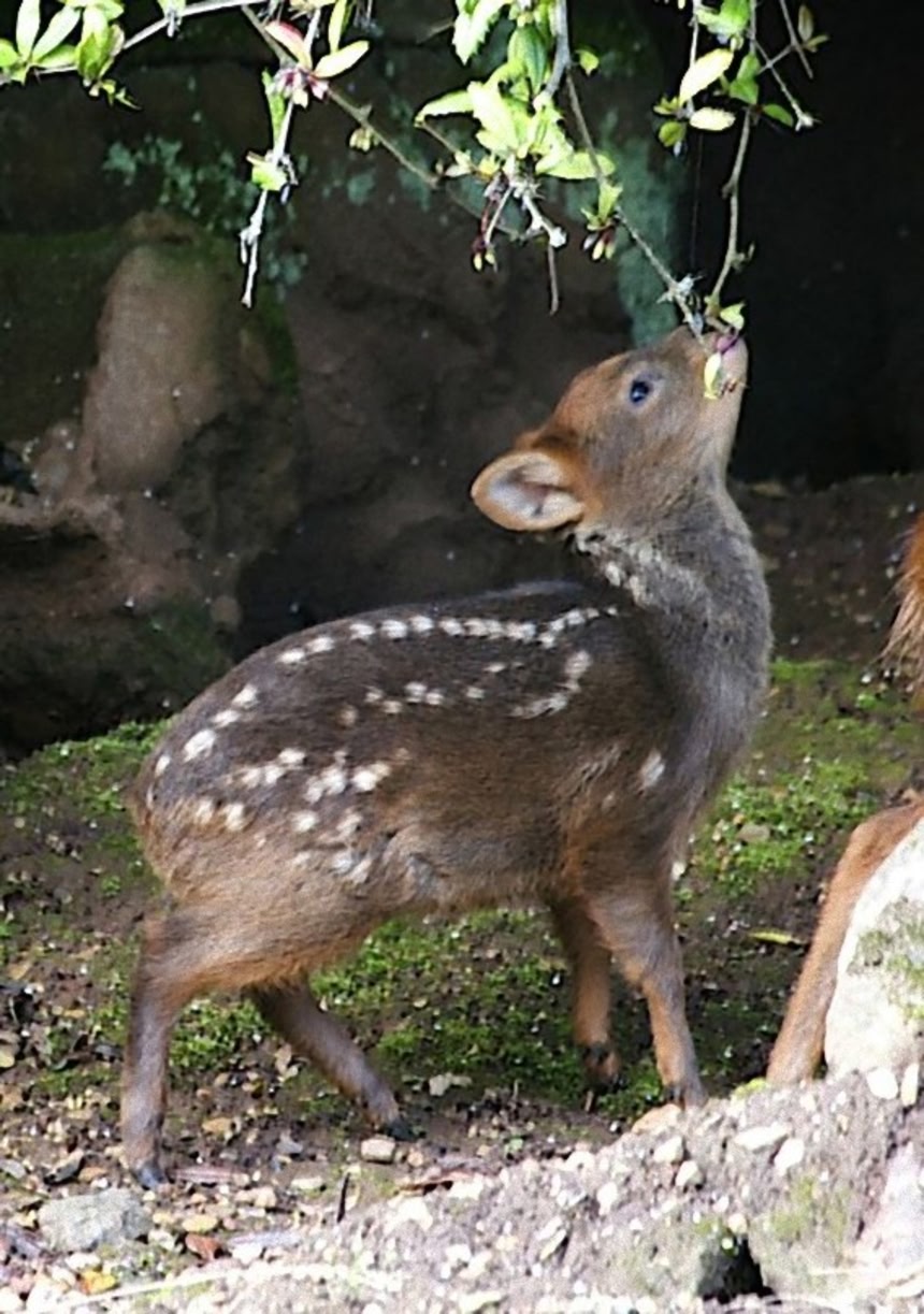 成獣でも体長70-83cm、尾長3-5cm、体重7.5-13.4kgと、シカ科の中では最小種と言われている「プーズー」の赤ちゃんが、英ブリストル動物園で生まれたそうだ。プーズーの幼獣には捕食者からカモフラージュする為に白い斑点がある。ウリボーみたいでかわいいね。