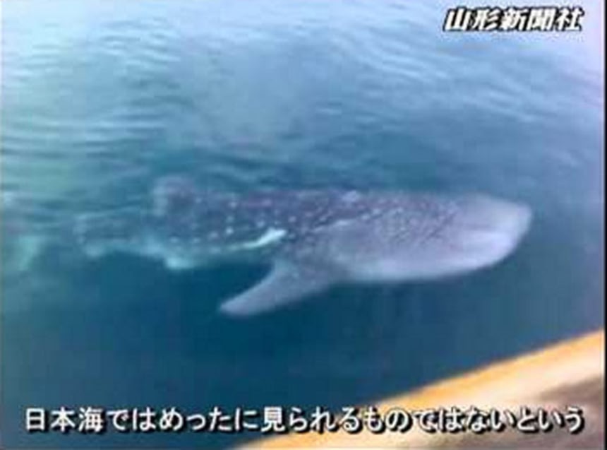 寒河江市内の男性は6日午前5時すぎ、離岸堤で釣り中、体長4~5メートルの若いジンベエザメを目撃。携帯電話のカメラ機能で撮影した。男性の足元近くを15分間ほど右や左にゆったり泳ぎ、去っていったという。「道理で魚が全く釣れなかったわけだが、貴重な経験ができた」と男性。