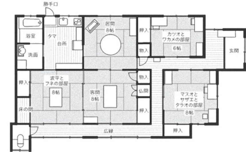 サザエさんの家の間取りは長い間見てたせいか、間取りを見なくても何となく分かるw