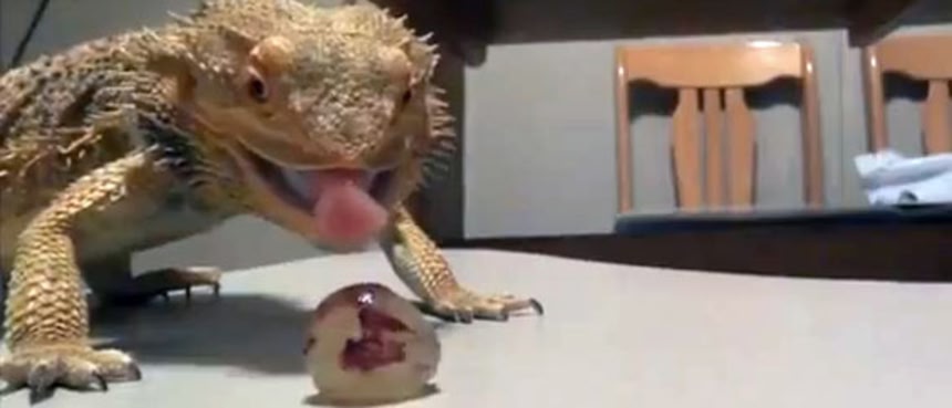 現世のミニ恐竜みたいな容姿が男前なフトアゴヒゲトカゲ。食性は雑食なので、昆虫などの他に植物質なども食べるそうだが、ここのお宅のフトアゴヒゲトカゲ、ブドウを攻略するのにかなり苦戦している模様。
