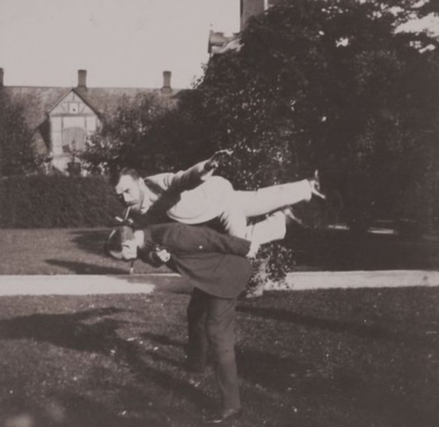 この画像を大きなサイズで見るロマノフ朝第14代にして最後のロシア皇帝、ニコライ2世がともだちとじゃれあっているところ(1899年)
