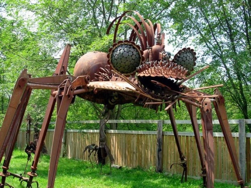 この画像を大きなサイズで見るタイムマシンのようなもの、ロボットの巨大昆虫。昔の人が思い描いていたような近未来の彫刻物がスクラップ金属を利用して作られ、それらすべてが一体化したように並んでいる。