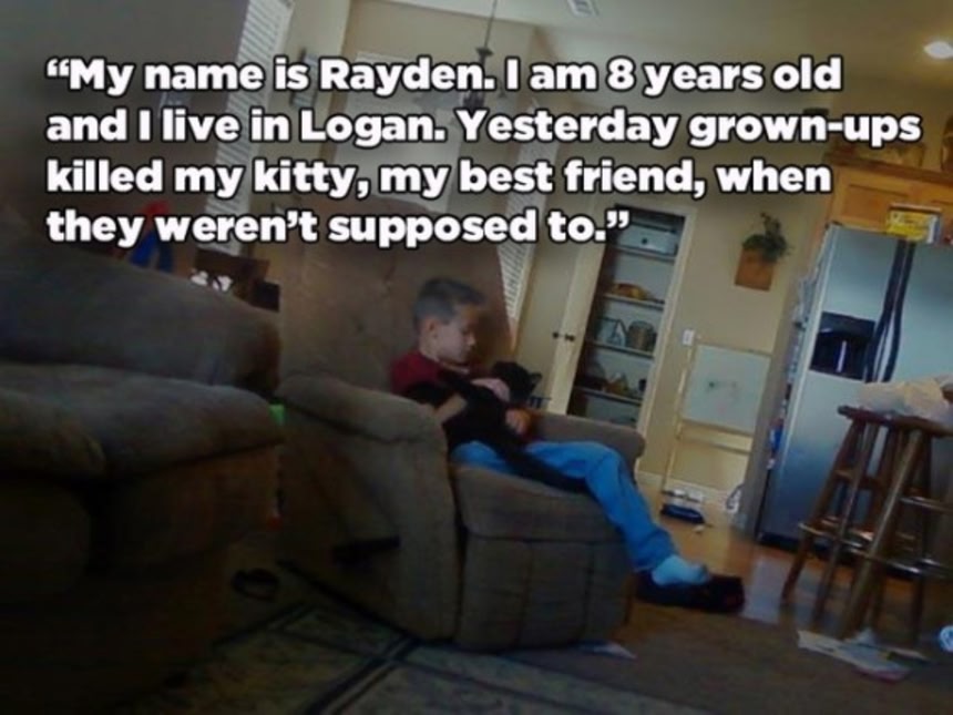 ぼくの名前はライデン。8歳で、ユタ州のローガンに住んでいます。昨日、大人たちがぼくの大切な友だちだった猫を殺してしまいました。彼らにそのつもりはなかったとはいえ、この気持ちをどうしていいのかわからないので、パパにぼくの思っていることを書いてもらっています。