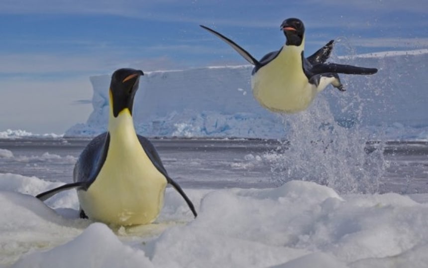 この画像を大きなサイズで見る南極、ロス海。ヒョウアザラシに追われていたコウテイペンギンが氷に向かってジャンプ