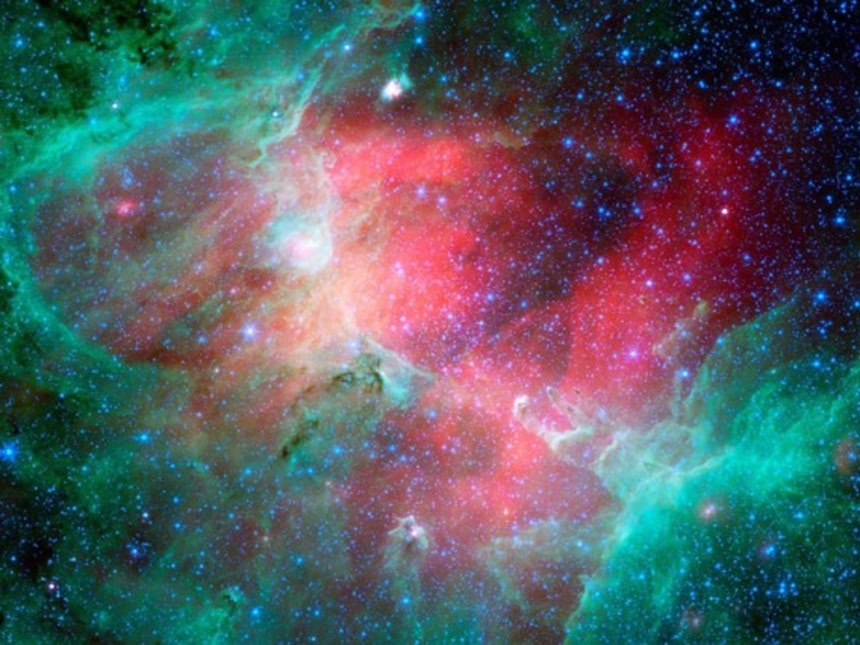 この画像を大きなサイズで見るハッブ宇宙望遠鏡で撮影すると可視光の高温のイオン化ガスが強調され、赤外線望遠鏡で撮影すると低温の塵や分子ガスが強調される。同じ星雲でも、見る光の種類が違うと見え方が大きく変わる。