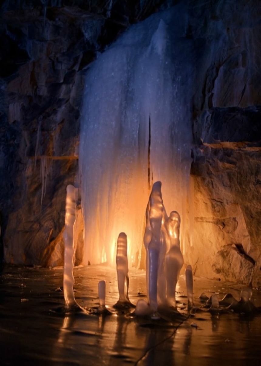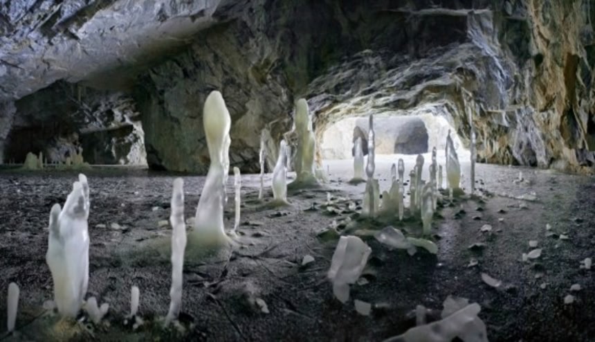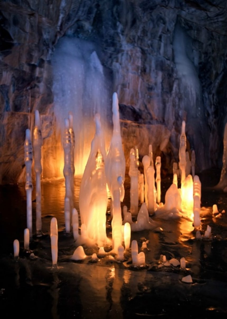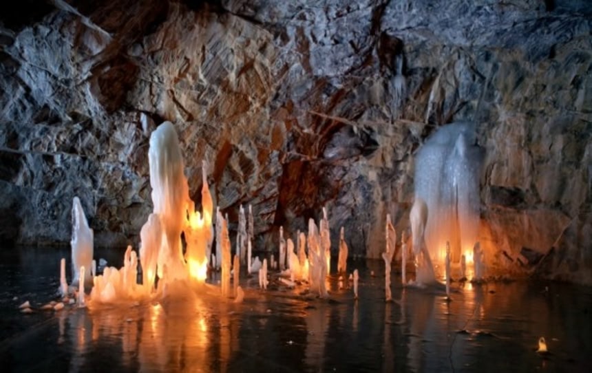 ロシア連邦、北西連邦管区に属する共和国の一つカレリアにあるという深さ10メートルの巨大な穴にあるRuskeala洞窟は、近くの採石場の爆発により1950年代にできたものだそうだ。中は非常に低温状態となっているため、曲線を帯びた氷の塔は、1年中、そのままの形状を保ったままだという。