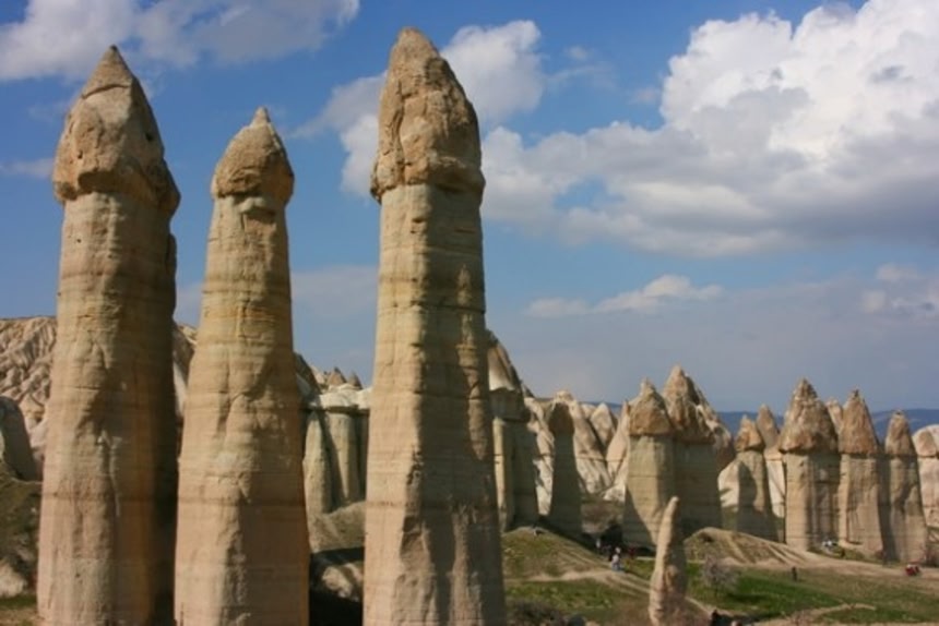この画像を大きなサイズで見る火山の噴火活動は4000年前まで続き、柔らかな凝灰岩の層が150メートルもの厚さになった。山に囲まれた谷に溶岩が流れ込んで、氾濫した川の水と強風が、妖精の煙突と呼ばれるような奇怪な形の岩を作った。マッシュルームや、尖がり帽子、円錐形のような形のものもある。観光客に人気の場所で、熱気球での空中遊泳やトレッキングも楽しめる。