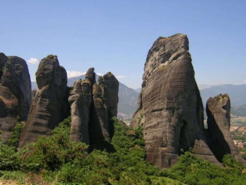ギリシャで、アトス山に次いで二番目に規模が大きく、重要な東方正教会修道院のひとつ。中央ギリシャはテッサリアの北西の地にあり、砂岩の柱の上に6つの修道院が建てられている。柱の高さ400メートルになるものも