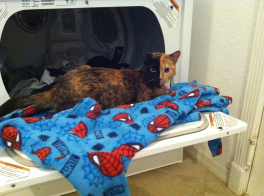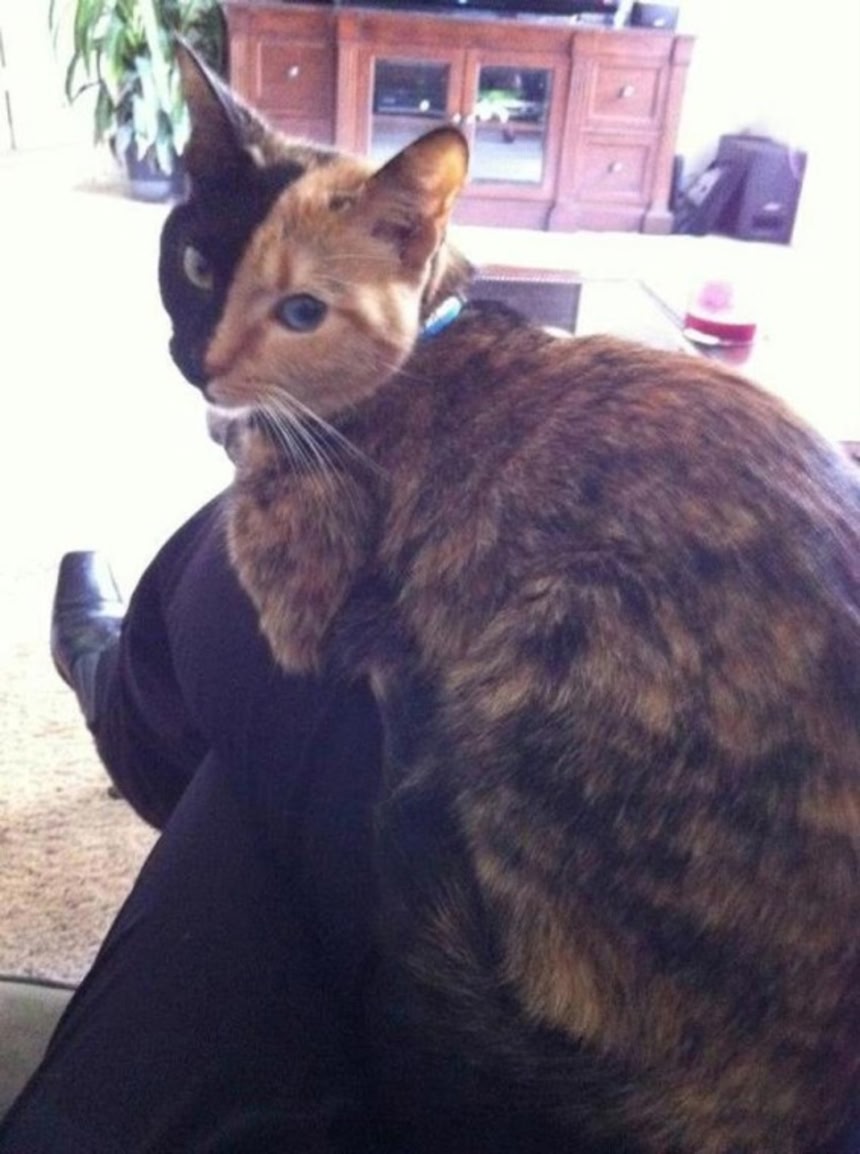 この画像を大きなサイズで見るこちらのトータシェル(黒と茶のぶち柄)の猫、ヴィーナスさん(3歳、メス)は、顔の半分からまったく違う柄となっており、世界で最も有名な猫となった。