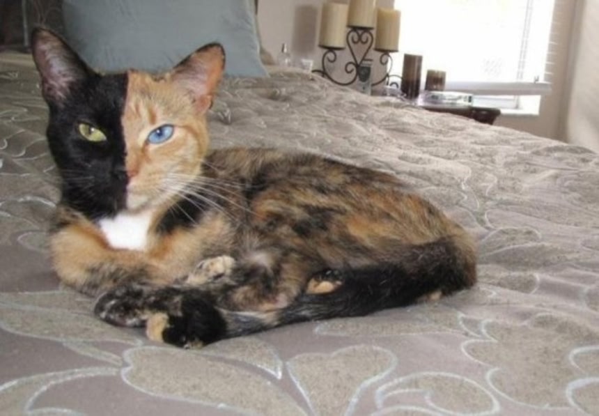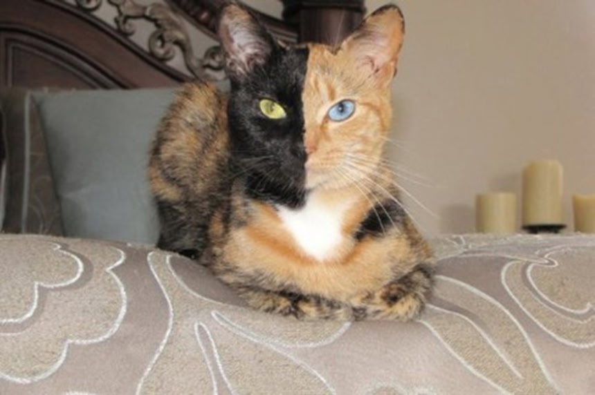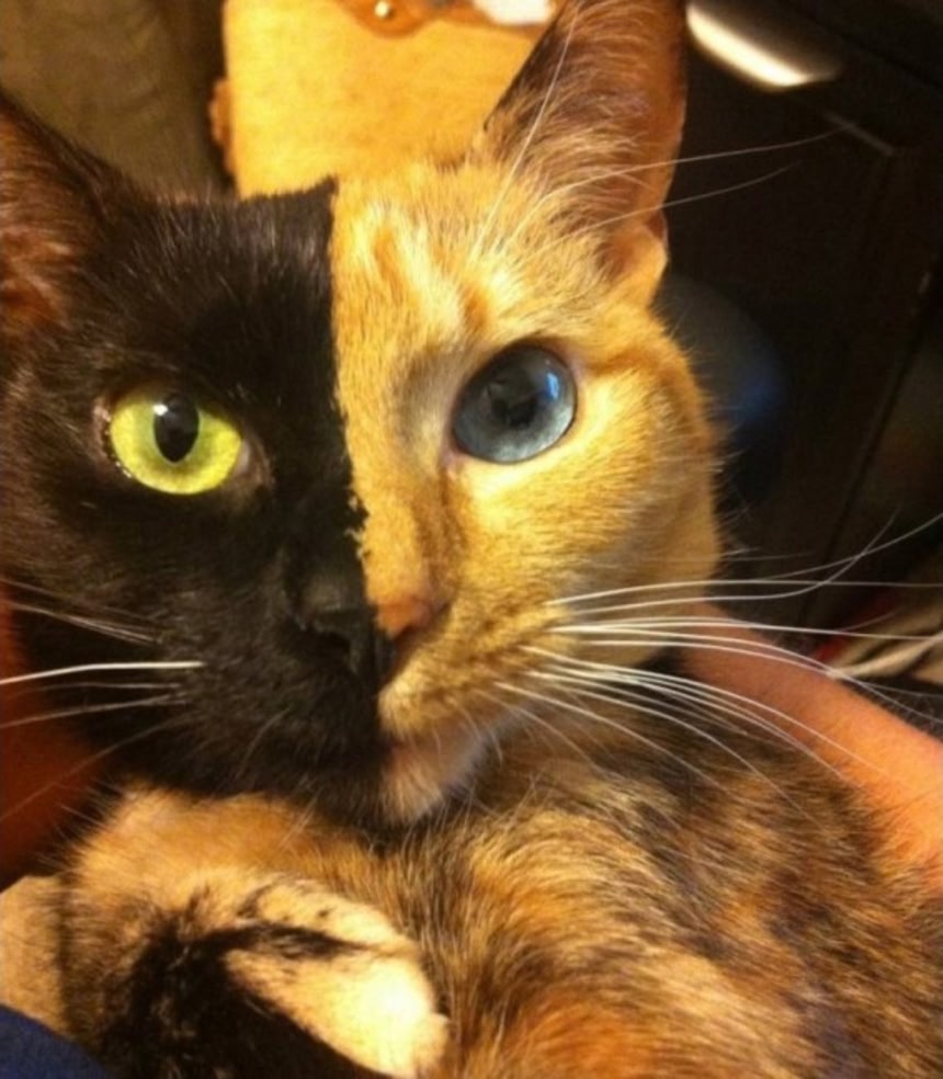 神話に登場する怪物のキメラ(キマイラ)は、さまざまな動物の部位を寄せ集めた身体を持つが、キメラと呼ばれる顔半分の柄が違う猫の場合、2つの受精卵が融合した結果、2種類の異なる遺伝子の細胞を併せ持つ個体をいうそうだ。