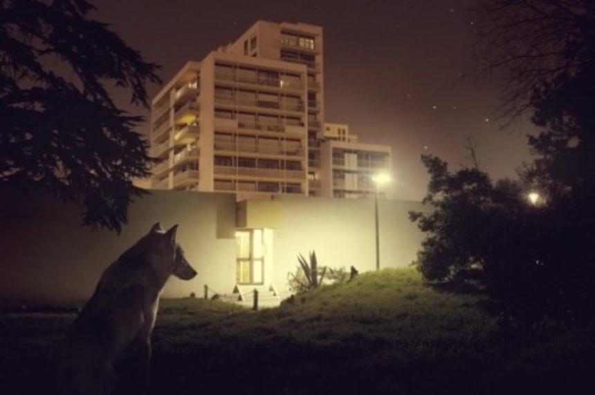 突如都会に現れた野生生物たち、身をひそめながらも都会暮らしに徐々になじんでいく。というテーマで作成されたフォトアート作品だ。
