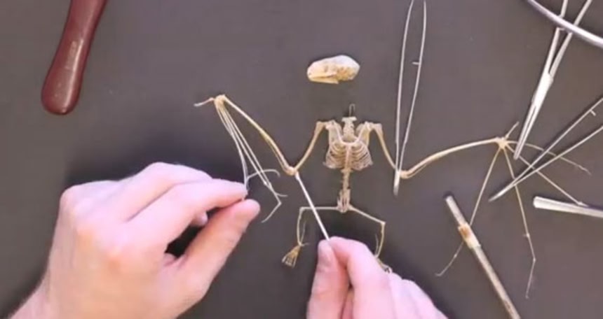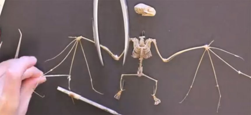 まずはホルマリンに漬け込まれていたジャマイカフルーツコウモリを取り出し、手作業で解剖作業が行われる。皮を剥いで、肉の部分を取り除いたら、さらに完璧に骨だけにする為「虫の部屋」へ。虫たちに肉を完全に取り除いてもらったら、過酸化水素水溶液に漬けて漂白し、プラモデルを組み立てるがごとく、骨のパーツを正しい位置につなぎ合わせればはい!できあがり。