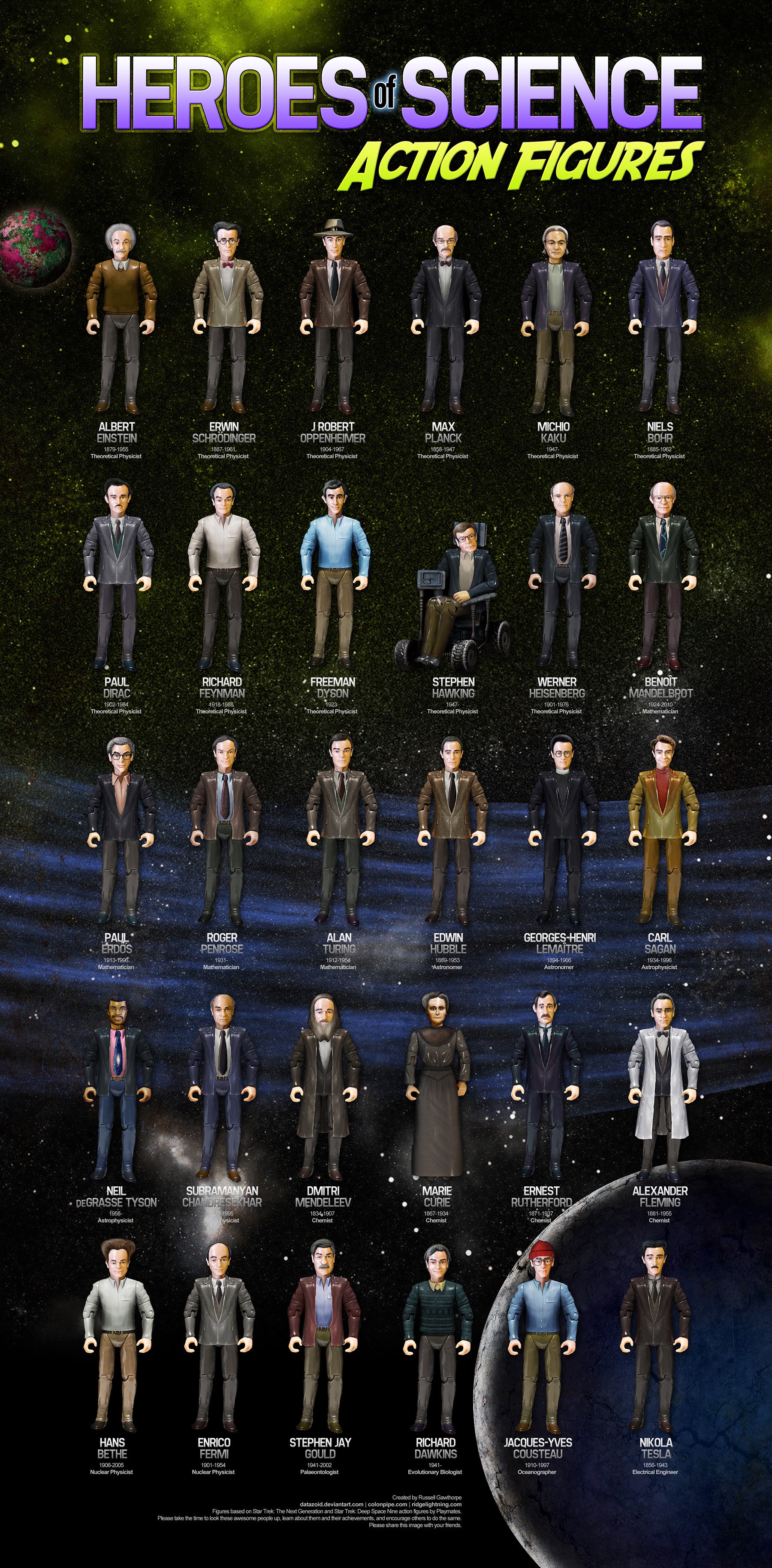 世界のアート職人が集うDeviantARTist で、総勢30人の実在する科学者たちのサイエンスヒーロー・アクションフィギアが公開されていた。