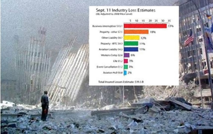 011年9月11日、ニューヨークはテロリストの攻撃を受け、おびただしい人命が奪われ、ツインタワーも崩壊した。これは単独の案件として、保険業界史上、間違いなくもっとも高額な保険金が請求された事件だろう。業務の中断、物損、生命保険、その他多くの対象に支払われた保険金は400億ドル以上(3.27兆円以上)となった。