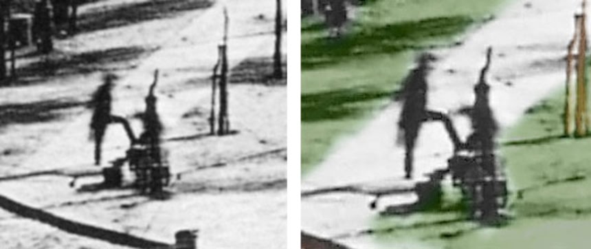この画像を大きなサイズで見るしかし、上記の1838年の写真には、靴を磨いてもらっているひとりの男が通りにいるのが見える。この写真を撮ったのは、ルイ・ダゲール。まさか、170年後にインターネット上で「人物を撮った最初の写真だ。」と指摘されて注目を浴びるとは思いもよらなかっただろう。写真をカラー化して、より鮮明にしたものも出回っている。