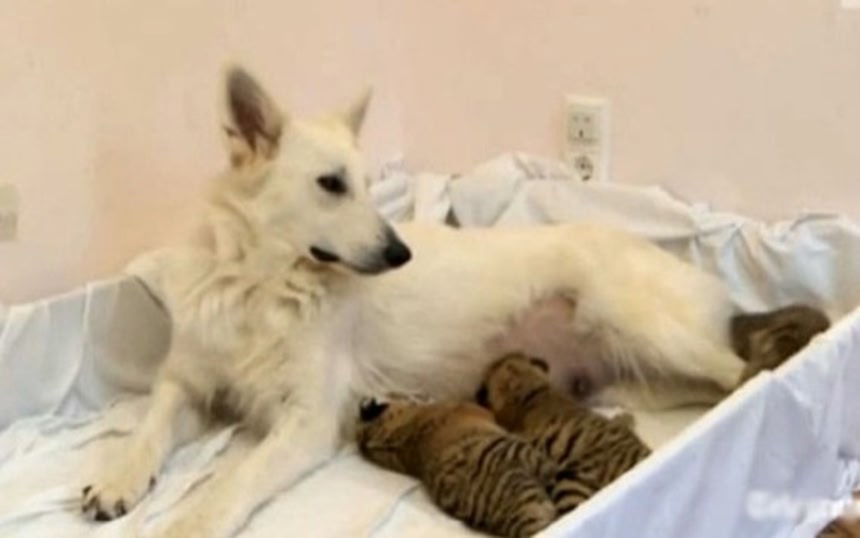 ロシア南部、ソチにあるオクチャブリスカヤ動物園では11月14日、3匹のトラが誕生した。ところがトラのお母さん、この子たちを育てることを放棄してしまったようで、動物園側では急きょ、ホワイトスイスシェパード犬のタリムさんを代理母として起用した。