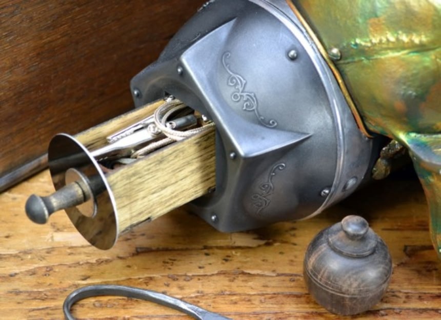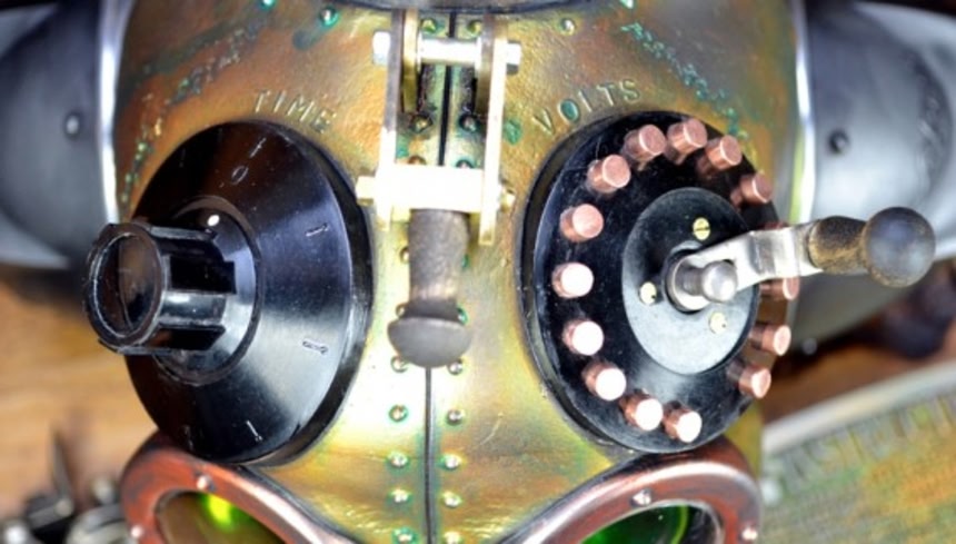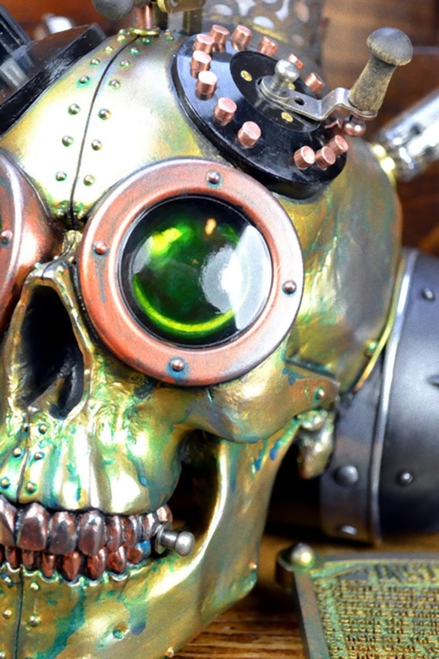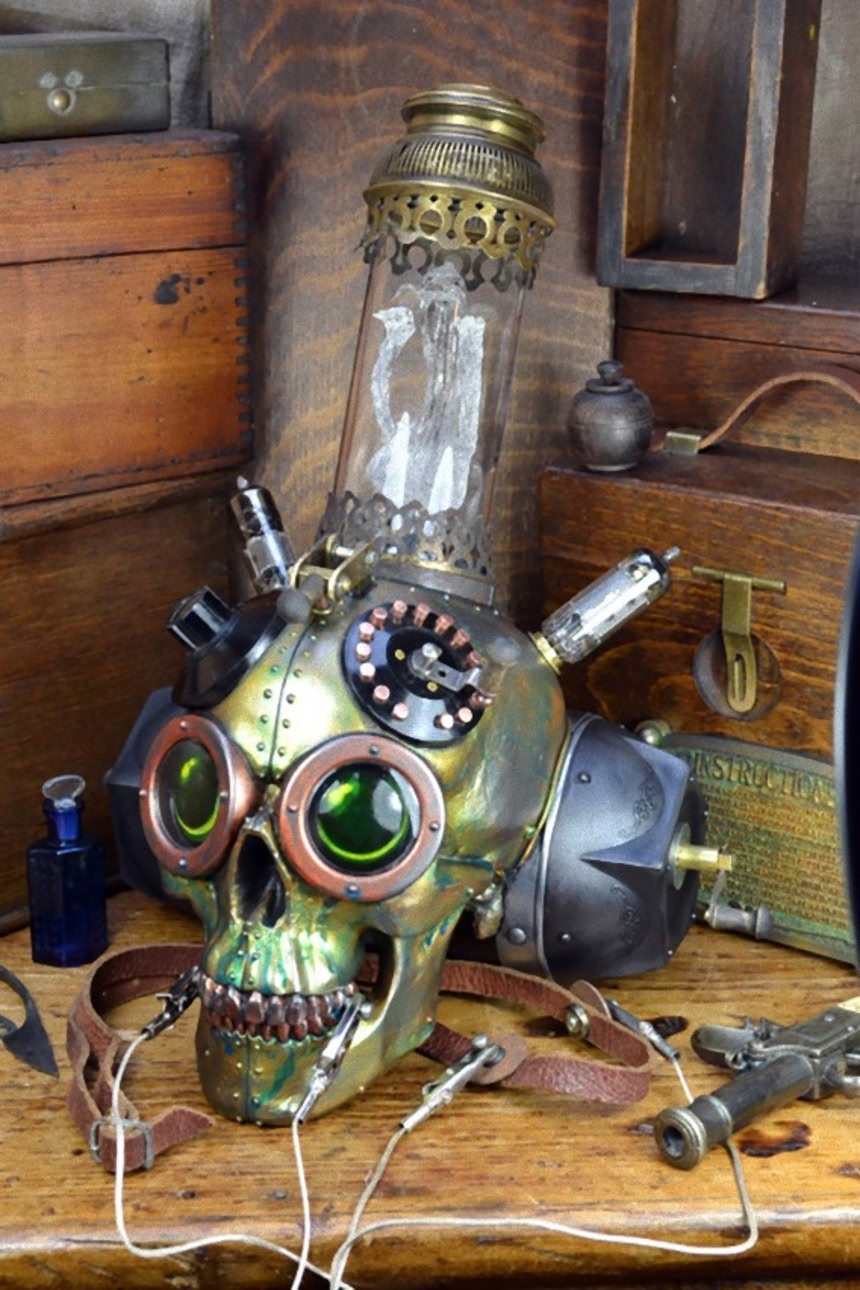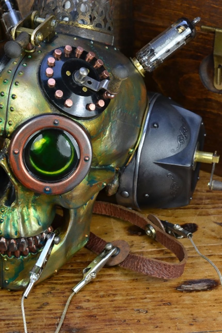 実物大の樹脂製の人間の頭蓋骨、古い真鍮のランプのパーツ、エポキシ樹脂、MDF(主配線盤)、リード、アクリル樹脂、ポリエステル樹脂、銅版、真鍮、ゴム、ガラス、ビニール、ABS樹脂(アクリロニトリル・ブタジエン・スチレン)、古い革のストラップ、発電機による光システム