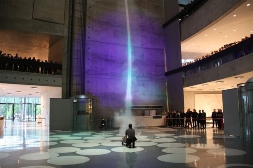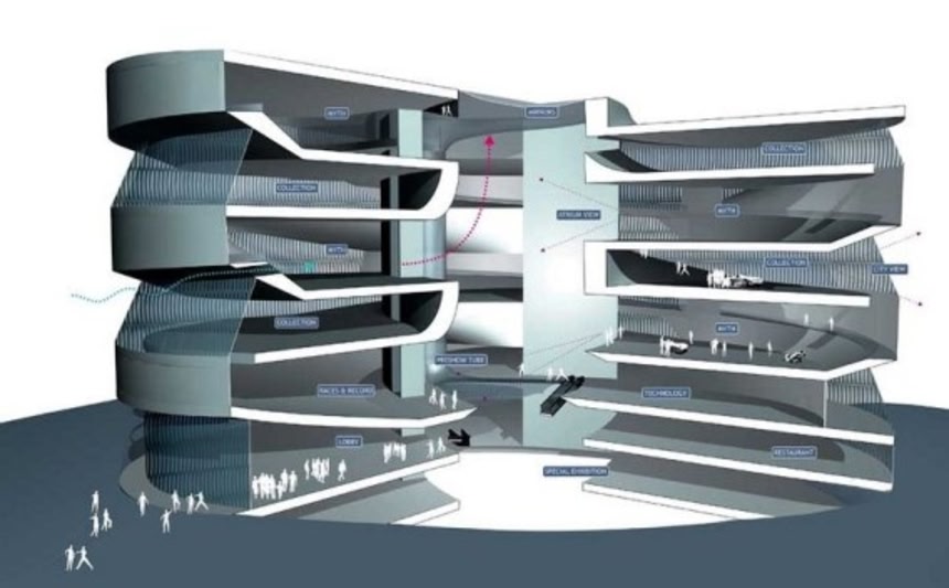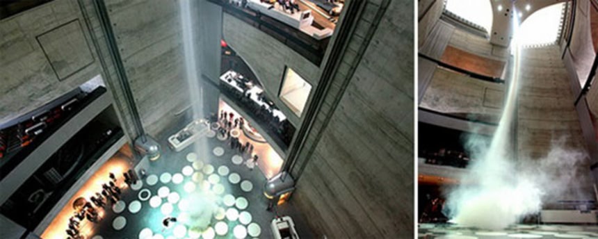 この画像を大きなサイズで見る自動車の博物館に竜巻というコンビネーションに違和感を感じるかもしれないが、実はこれにはわけがある。この博物館は各フロアごとに仕切りがなく、その独特な構造のため煙を遮断する扉を設置することができない。火災が発生した場合、煙が全フロアに行き渡ってしまう恐れがある為、このような巨大竜巻発生装置を中央ホールに配置することで、建物の煙を全てここに集め天井から排煙させるという、いわば火災対策の為に造られたのだそうだ。