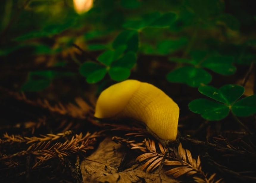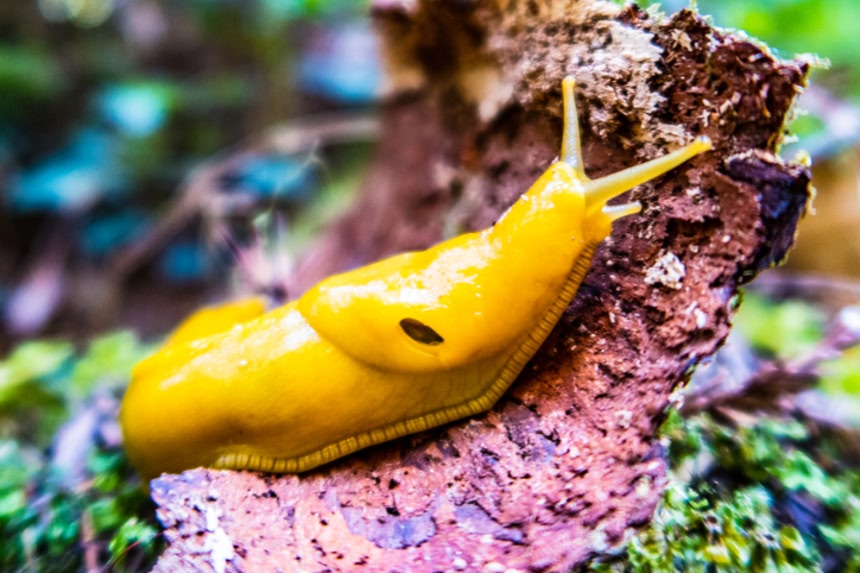 バナナナメクジはゆっくりと森の地面を移動しながら、枯葉や動物の糞を掃除していく。