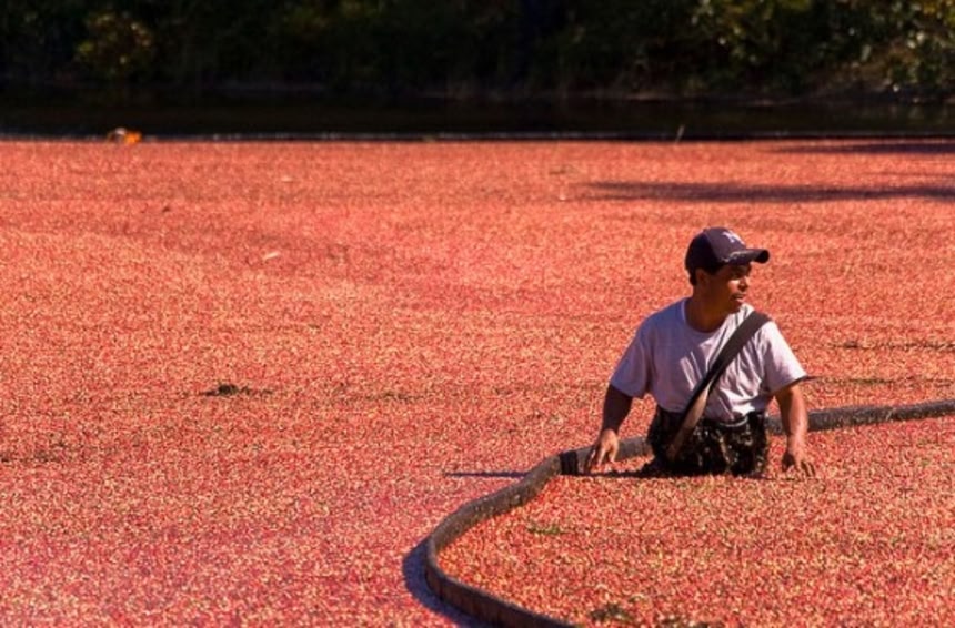 お菓子やジャム、ジュースなど、日本でもなじみの深い果物、クランベリー。その収穫方法は一風変わっていて、クランベリーの畑(ボグ)に水を張り、水中でクランベリーの木を揺すって果実を水面に浮かせ、それを大型の機械で一気にすくい取っていく。