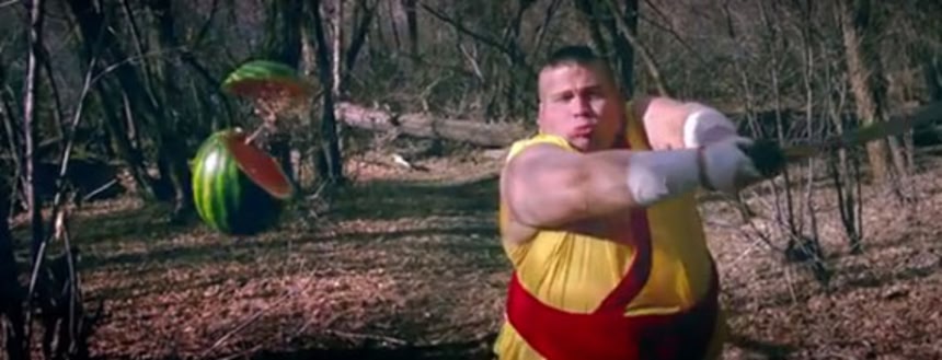 この画像を大きなサイズで見るフルーツを粉砕することがどんな地球の平和につながるのかはわからないままに、フルーツ忍者はその体脂肪率を武器に、様々なフルーツをぶった斬る秘密特訓を行っているみたいなんだ。そしてこれは、人気のアプリゲーム、フルーツ忍者の実写版でもあるわけなんだ。