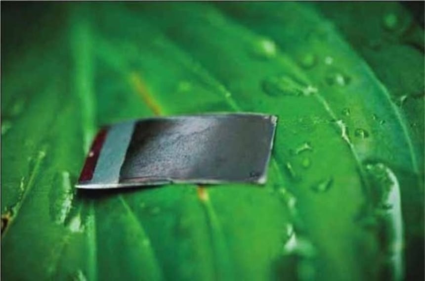 この画像を大きなサイズで見る割安の材料を使って、ダニエル・G・ノチェラは世界初の人工葉を作った。自給自足 システムは光合成と同じだが、酸素の代わりに水素をつくり出す。水素は燃料電池に蓄えられ、遠隔地においても電気として使える。