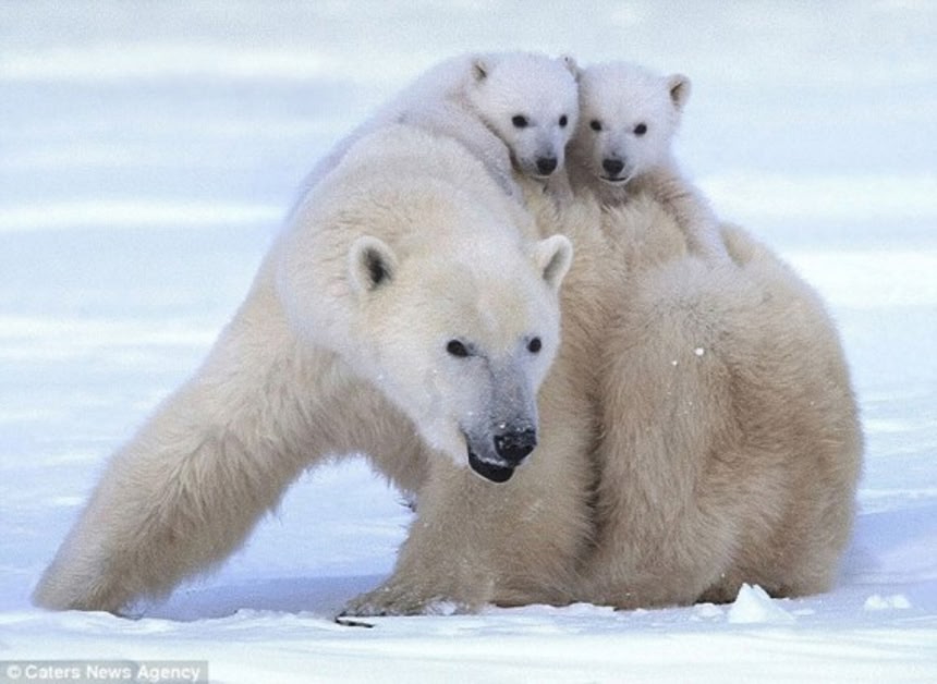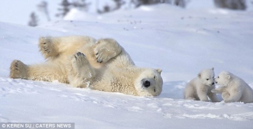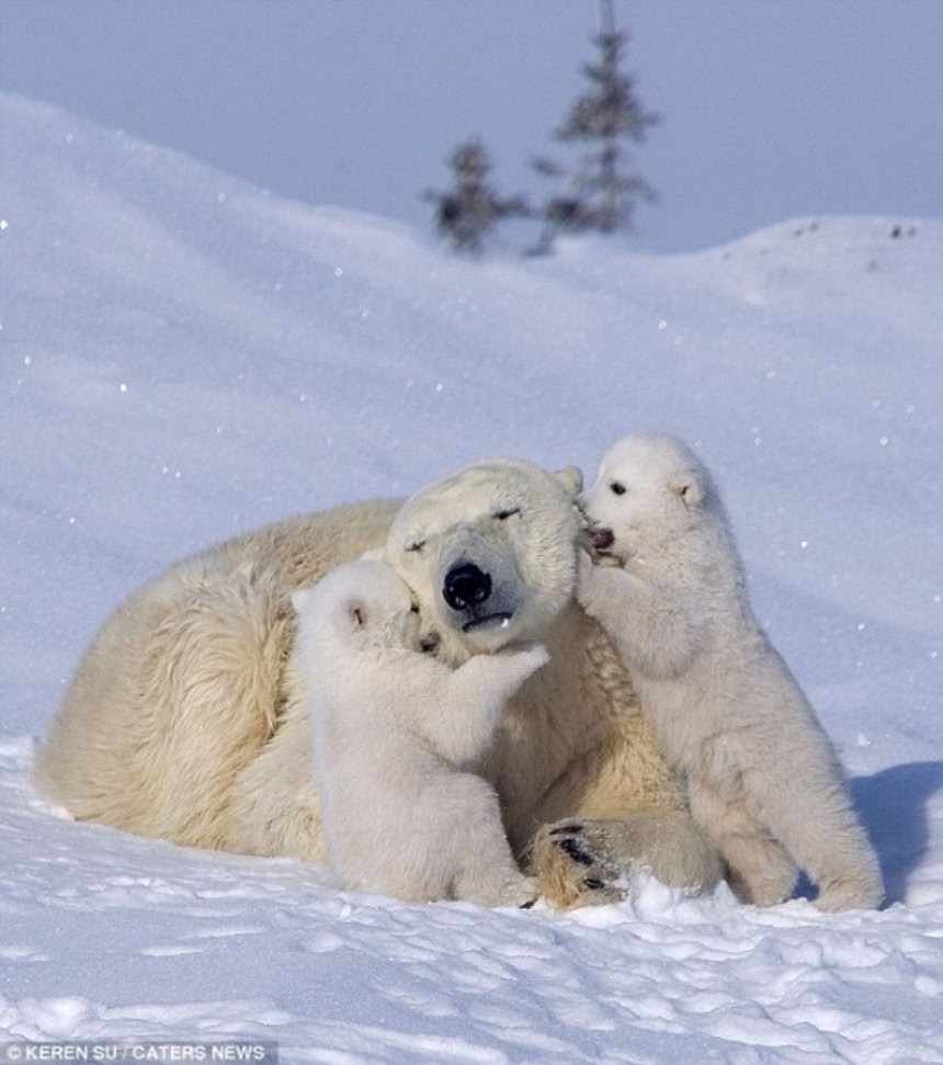 あたり一面の雪景色に同化しながらシロクマのお母さんは、2匹の子どもたちを大事に大事に見守っている。お母さんがそばにいるので安心マックスなシロクマの子どもたちもとってもリラックスムード。心がポカポカ温かくなる光景だね。