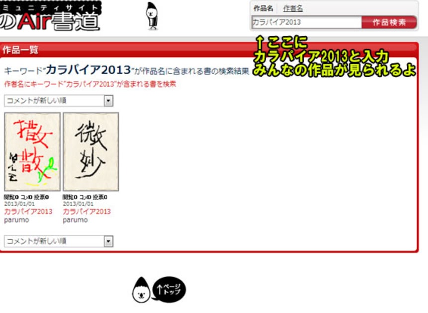 投稿できたかどうかを確認してみよう。画面右上の検索窓に「カラパイア2013」もしくは自分のツイッターIDを入力すると確認できるよ。