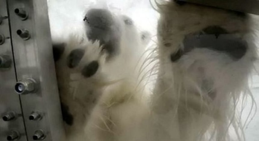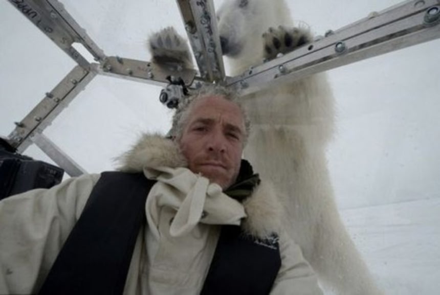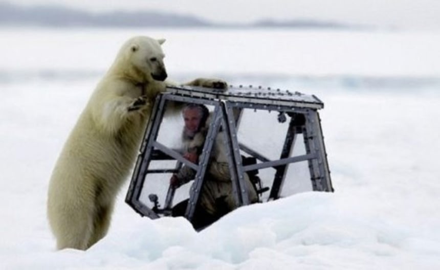 ノルウェーのスバールバル諸島にて、アザラシを観察していたBBCの野生動物カメラマンのゴードン・ブキャナン。ブキャナンはアクリル樹脂のプレキシガラスで覆われたキューブ状のケージの中にいた。そこに近づいてきたのは空腹状態のメスのホッキョクグマ。どうやら餌を探していたらしい。