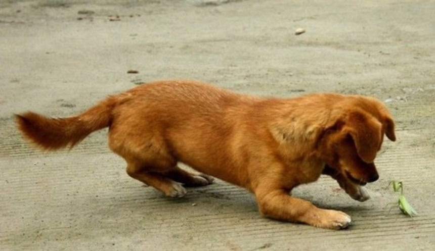 この画像を大きなサイズで見る犬の好奇心を触発したカマキリ、戦闘態勢に入る
