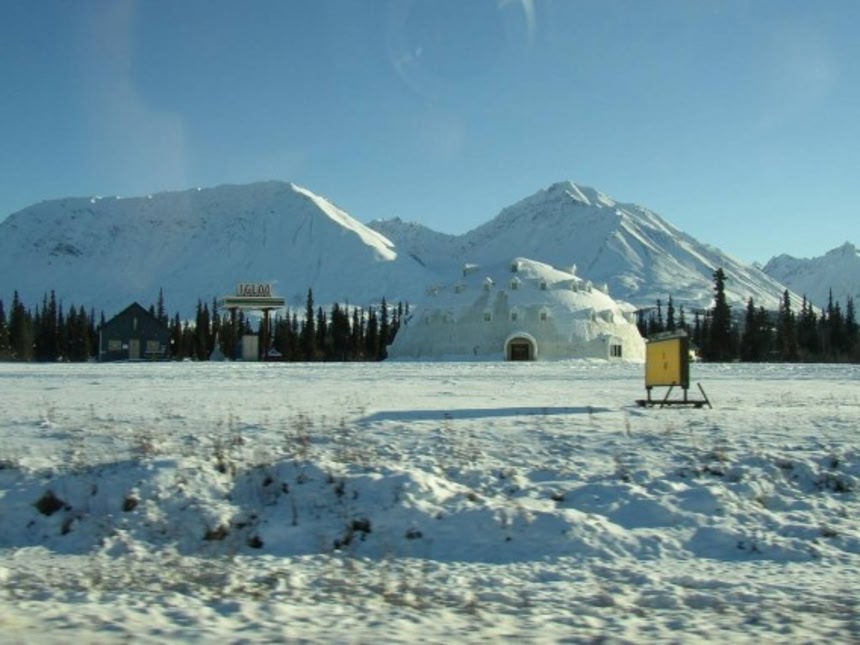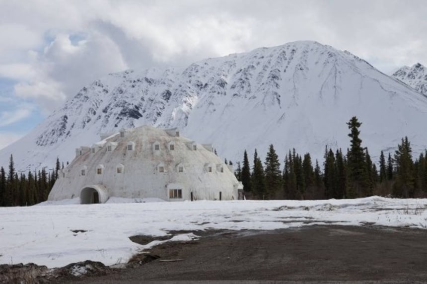 米アラスカ州のジョージ・パークス・ハイウェイに今も尚、その姿をとどめる巨大なイグルー型のホテル廃墟。このドーム型のホテルは今では道しるべとして利用されている。
