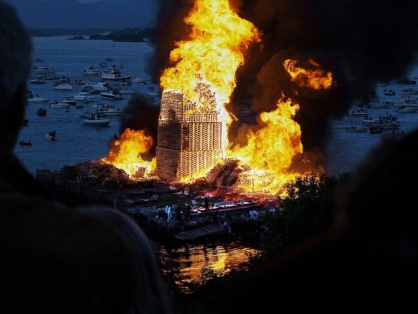 ノルウェー、オーレスンでは、毎年6月24日(夏至の日)ごろ、洗礼者ヨハネの誕生を記念して巨大なかがり火が、海沿いの人工島に設置されるという。木箱や樽がジェンガのように積み上げられ、高さ40メートル以上にも及ぶ巨大な木の柱を一気に点火する。