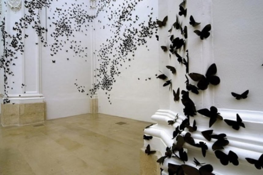 紙製でできた黒い蝶々を数百、数千単位で、白い壁の一面に張り巡らせた背筋が寒くなるような不吉な予感のする光景。