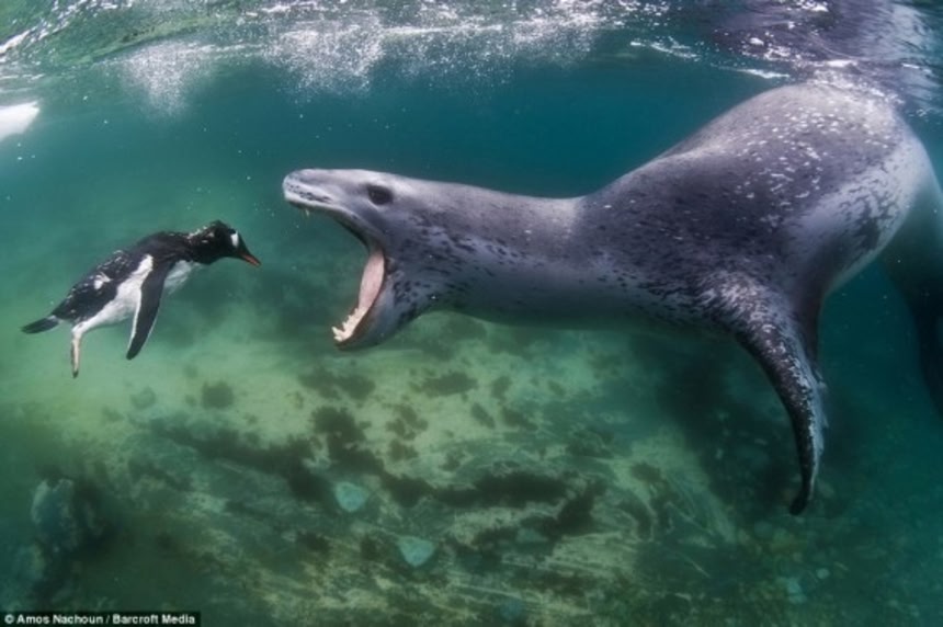 ”浅瀬に遊びに行く若いペンギン達は、ヒョウアザラシの待ち伏せ行動についての知識が無いのです。”と、イスラエル特殊部隊から野生動物の写真家になり、この凄まじい一瞬を撮影したアモス・ナチョウム氏(63)は語る。