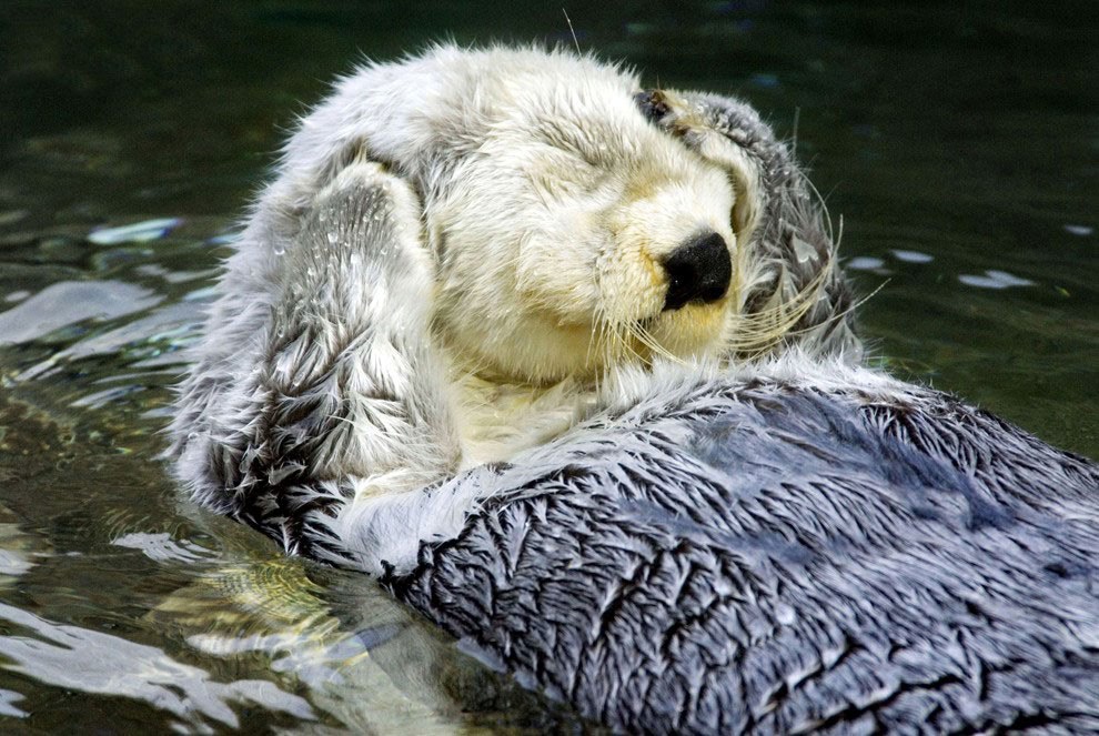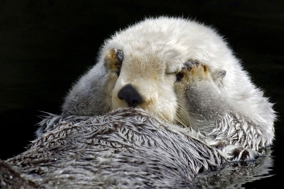 眠すぎてなかなか起きられなかったラッコ。お日様の光がまぶしすぎて、こんなかわいらしい姿で目覚めたみたいなんだ。