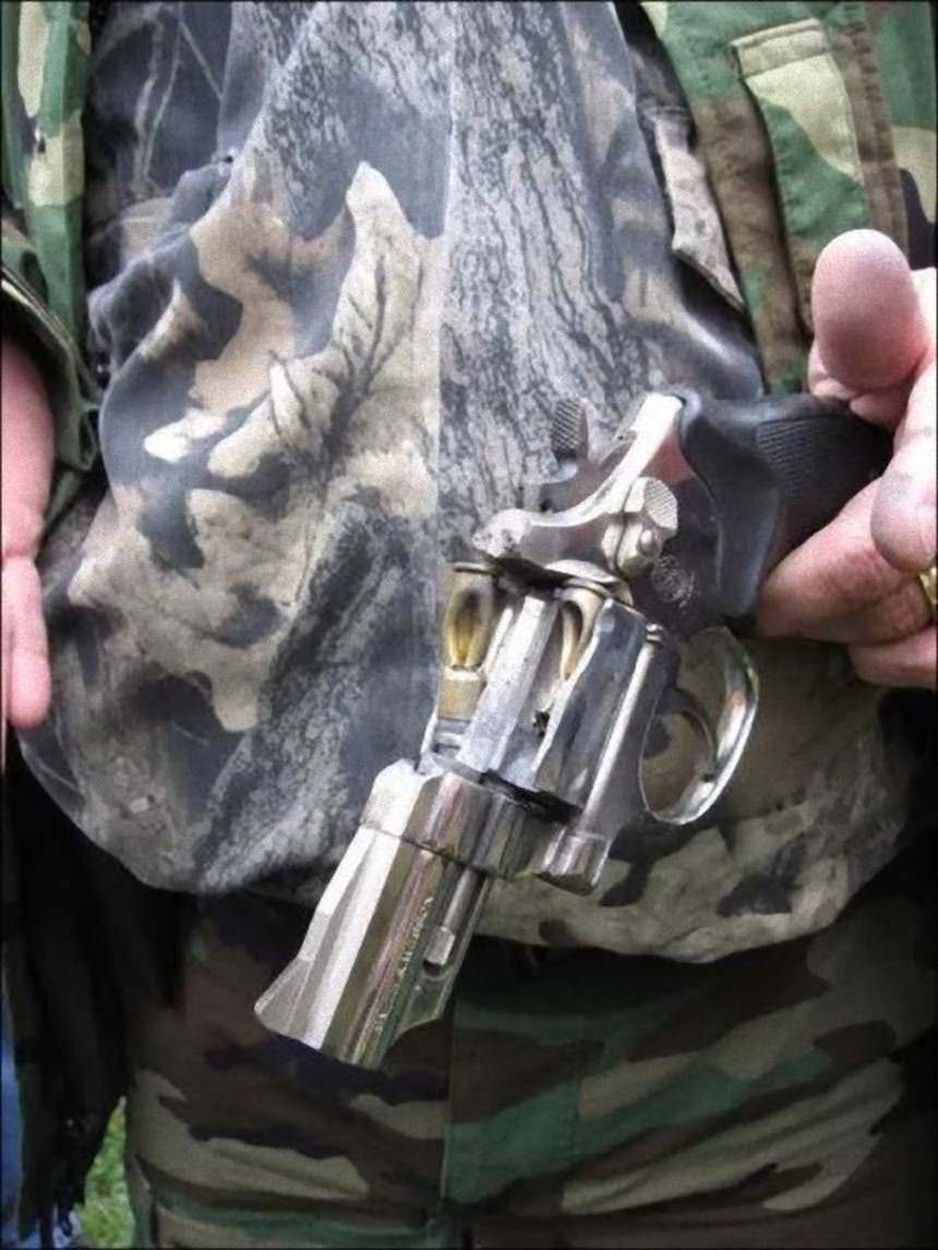 前弾は発射されてるようだし(S&Wは射手から見てシリンダーが左回り)、前弾がバレル内に詰って暴発という感じだろうか。幸い次弾は潰れてるだけみたいだね。