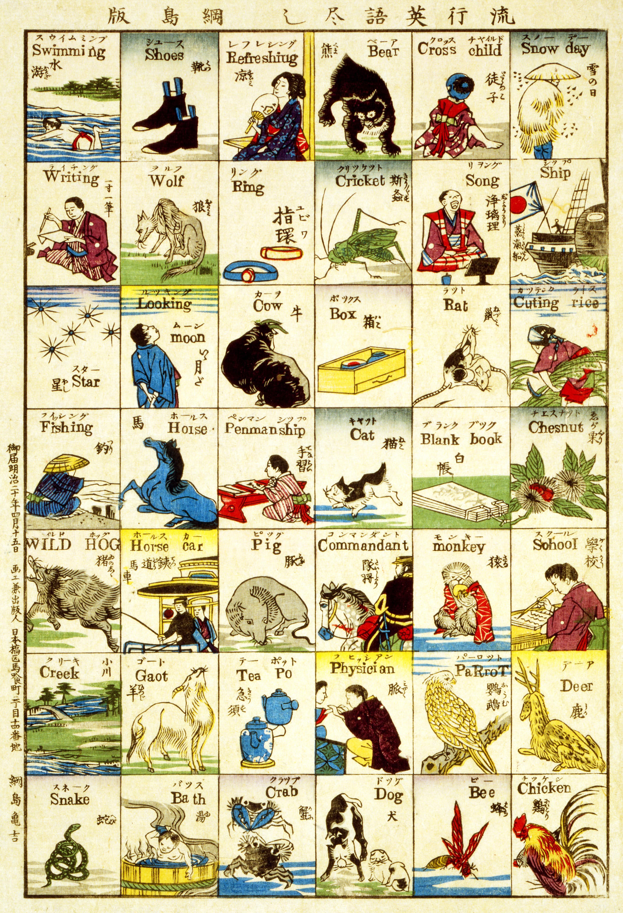 1887年、絵師である綱島亀吉によってつくられた英語を学べる木版画『流行英語尽し』が海外サイトで紹介されていた。この頃は、明治維新により西洋にならった近代的な学校制度により、外国語としての英語教育が導入された時期でもある。