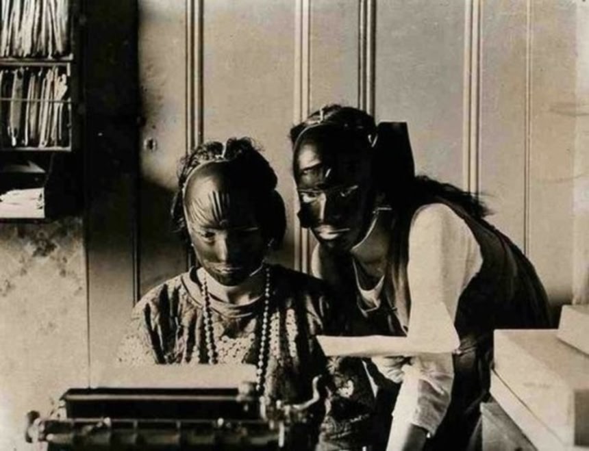 写真撮影で魂がとられるとかいう類の迷信がある程度信じられていた頃に、仮面をすれば大丈夫という話が流行ったりして、その頃の写真なんじゃなかろうか。