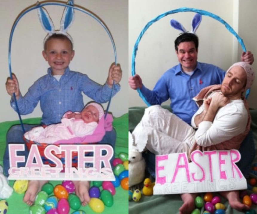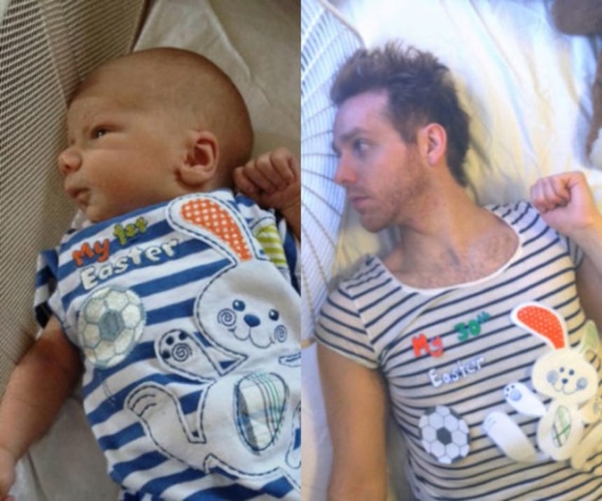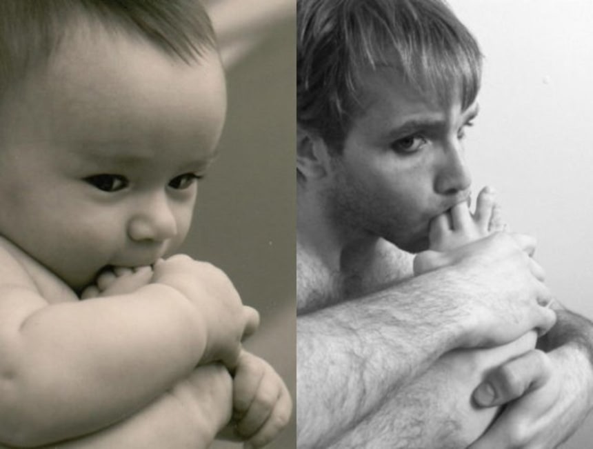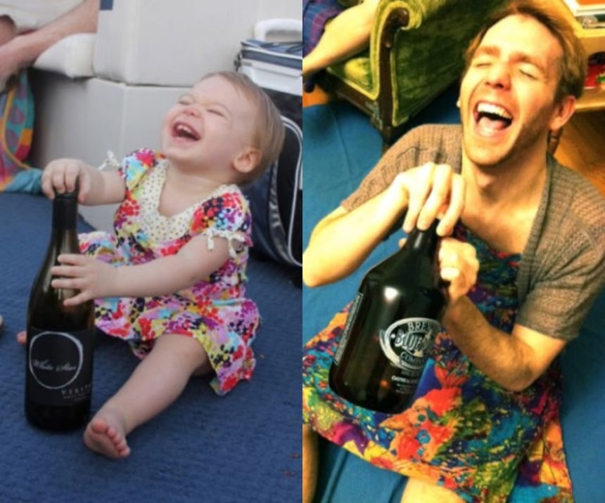 ニューヨーク在住のカナダ人ブロガーが、片っ端から赤子の写真のマネをしまくって撮影し、元写真と一緒に並べてネット上で公開し話題となっている。ポーズはもちろんのこと、表情や、服装、背景まで、こだわりまくっており、大きな赤ちゃんって感じなのがユーモラスだ。