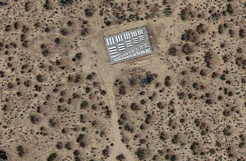 この画像を大きなサイズで見るアメリカには奇妙な印が描かれたコンクリート、またはアスファルト製の四角い厚板が数多く点在している。これらは、空撮用のキャリブレーション・ターゲット(または校正パターン)として作られたもので、その大半はアメリカ空軍とNASAによって1950年から60年代にかけて設置されたものだ。