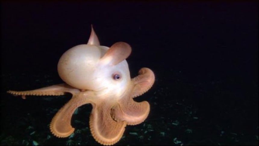 この画像を大きなサイズで見る深海には摩訶不思議な形をした生き物たちがその生を謳歌している。ダンボ・オクトパスもその中のひとつ。ダンボという名は、ずばり、ディズニーキャラクターのダンボからきているのだそうで、その名の通り、耳をパタパタしながら泳ぐので水中のダンボみたいだ。