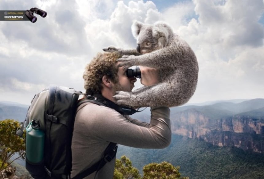 この画像を大きなサイズで見る野生動物のカメラマンの悩みは、好きなだけ被写体に接近できないことだ。日本の光学機器メーカーのオリンパスはむしろギョッとするぐらい見え過ぎのコアラを描いて、彼らの双眼鏡がどれほどその被写体に迫ることができるかを表現している。
