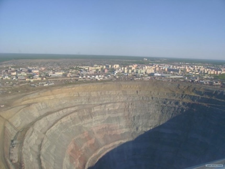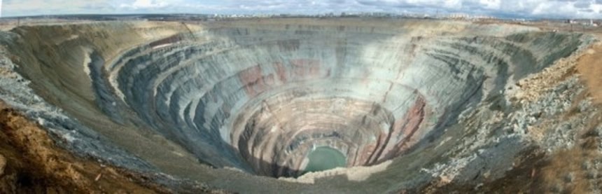 この画像を大きなサイズで見るミール鉱山は、ロシアの極東連邦管区の都市ミールヌイにある露天掘り鉱山。2004年に閉鎖されたが、深さは525m、直径は1,200mあり、ビンガム・キャニオン銅鉱山に次ぐ世界で2番目に大きな採掘穴だ。ダイヤモンド鉱山としては世界最大となる。この穴は上空に下降気流ができるほど巨大で、巻き込まれる事故を防ぐためヘリコプターでの飛行は禁止されている。