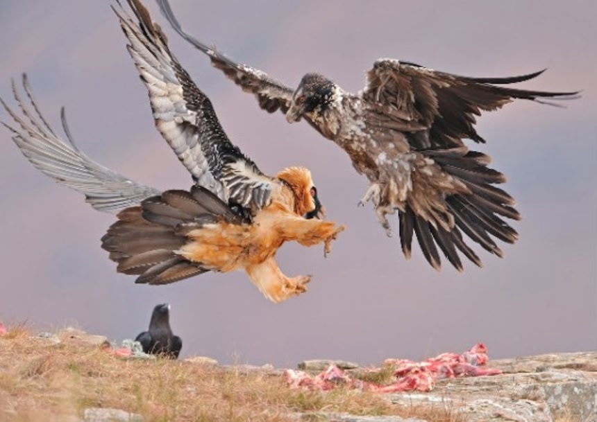 この画像を大きなサイズで見るヒゲワシもやはり、最大級の鳥類だが、猛禽類であることはほとんど知られていない。ヨーロッパやアジア、そしてアフリカに分布している。体重は8kg、翼を広げると3m超になる。ヒゲワシは主に動物の腐肉を探っては、骨を掴み上げて高所から落とすことで知られる。