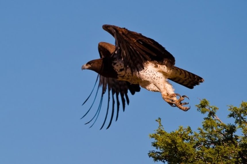 この画像を大きなサイズで見るゴマバラワシはアフリカで最も大きな鷲で、羽を広げた時長さは2.6m、体重は6.2kgにもなる。体に斑点があるので見分けるのは容易だ。非常に攻撃的な捕食者で、”捕まえたものは何でも食べる”という彼らの餌食スタイル。獲物はホロホロ鳥といった鳥類からヒヒ、ライオンの仔、そしてアンテロープまでと幅広い。また自分より大きな動物達を殺す能力も備えているが、そうした獲物を木に運ぶのは困難であり、地面の上で食べるのは天敵に狙われやすく非常に危険なため実際に行うことは稀だ。