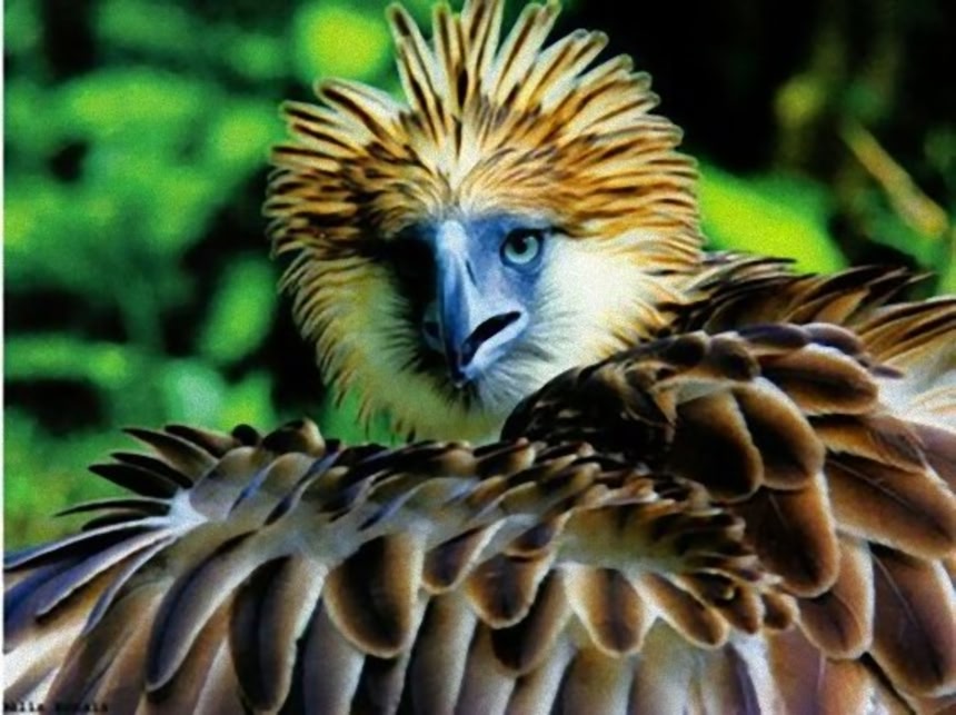 この画像を大きなサイズで見るフィリピンワシは木が茂る森林に生息する大型の鷲類の一種。この雄大な鳥は主にフィリピンで見られ、国のシンボルとなっている。体重は7kg、翼を広げると長さ2mにもなり、”たてがみ”を思わせる華やかな羽を持つ。主な獲物は猿で、ヒヨケザルや大型のコウモリ、さらにブタや犬までも捕食する。子どもをさらうという噂はあるものの、人を襲うことは決して無い。