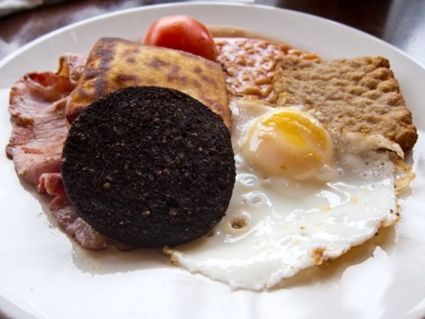 この画像を大きなサイズで見る目玉焼き、ブラックプディング(血のソーセージ)、豆、トマト、ベーコン、ソーセージ(四角いやつ)