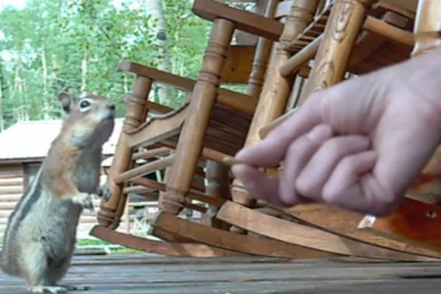 リスにナッツを差し出す人間。その手にあるナッツを食べたいが、リスここで気が付く。「カメラ回ってない?自分撮られてる?」人間ごときに差し出されたナッツをホイホイと食べているところを撮られちゃったらリスとしてのプライドが!と思ったのかどうかはわからないままに、とりあえずポーズとって退散したようだ。