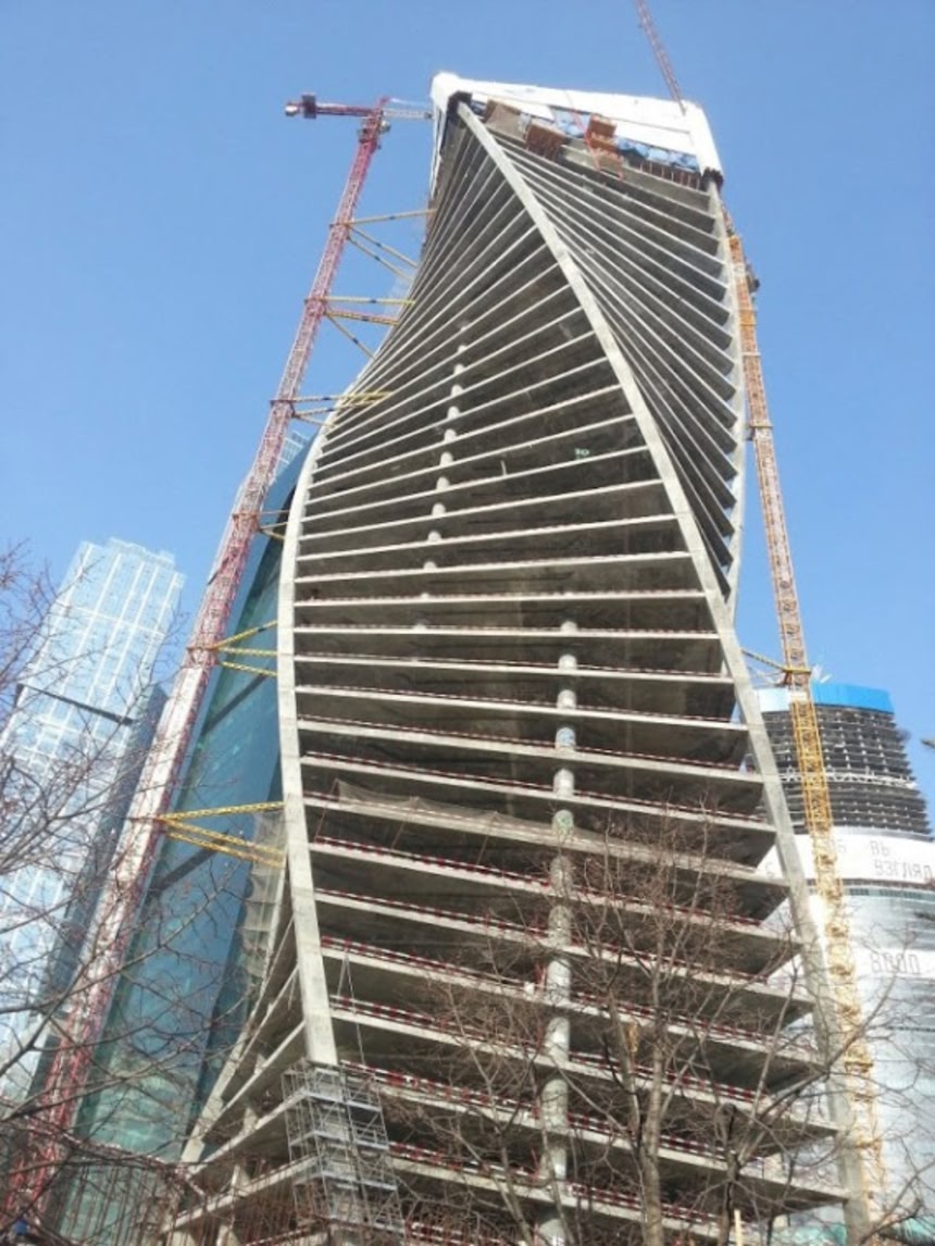 この画像を大きなサイズで見るモスクワ国際ビジネスセンターの中に現在建設中。各フロアは3度づつねじれていて、最終的に最上階は135度回転している。着工は2007年で、2013年に完成。4月より稼動し始める予定。デザインは建築家のトニー・ケトル。上の写真はコンピュータグラフィックによる完成予想図。下は工事中の写真。