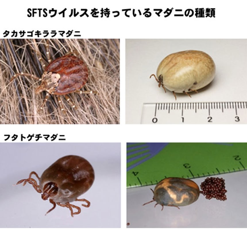 ※尚、日本で見つかったSFTSウイルスは、中国のSFTSウイルスとは、遺伝子レベルでわずかに異なるものの、同一種とみなされている。ヒト以外の動物でも、SFTSウイルスに感染するが、多くの動物は感染しても発病しないと考えられている。